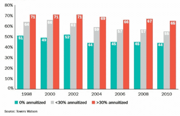 Chart 2: US retiree satisfaction rates by extent of annuitisation, full sample, 1998–2010