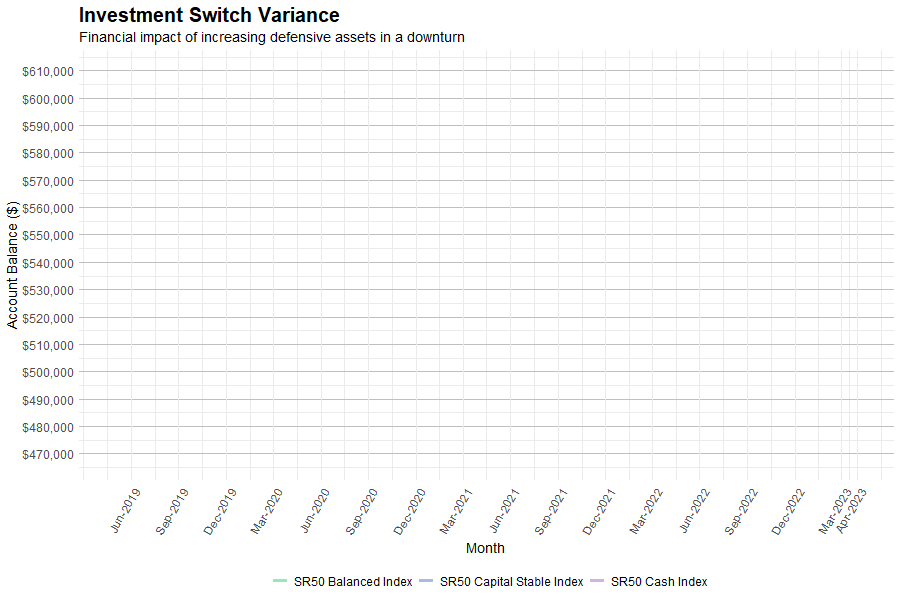 However, if they had stayed the course and remained in the Balanced option their account balance would have recovered to $610,259 by April 2023. That’s well above their pre-Covid high and slightly above the next peak of $610,000 in late 2021.