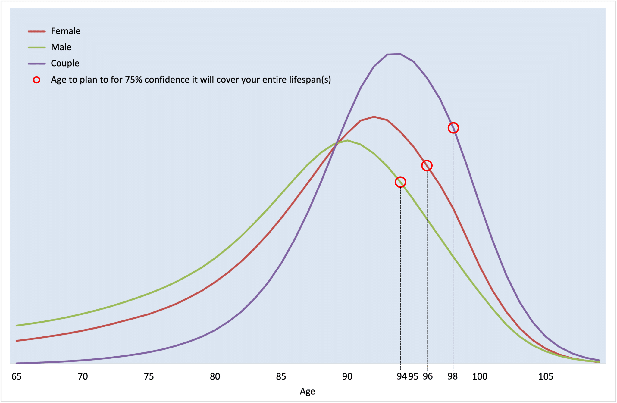 In the graph below, the number of deaths for 1,000 65-year-olds is shown for males, females and the longer living spouse of couples. Singled out on each curve is the age you should plan to that is high enough to cover 75% of people’s lifespans.