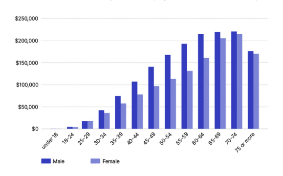 Women retire with less super than men, as they have a lower median super balance at all ages, according to the latest available statistics from the Australian Taxation Office (ATO). At age 60–64, the median super balance for a female is only $158,806, compared to $211,996 for males.