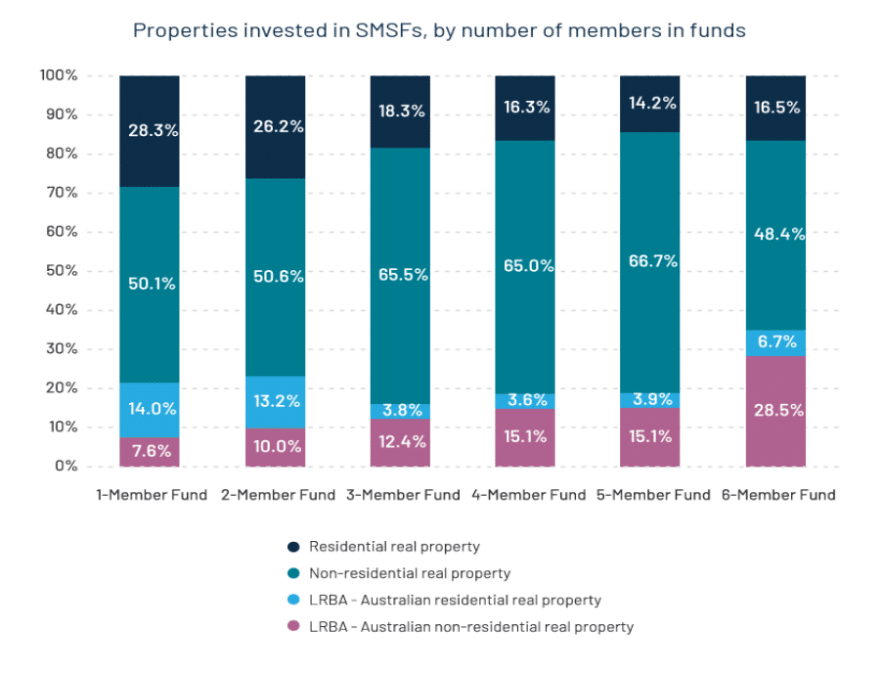 Breaking this down further, we can see that SMSFs with six members have the highest allocation to Australian non-residential real property using a limited recourse borrowing arrangement (LRBA) at 28.5%, while five-member funds have the highest allocation to non-residential real property outright at 66.7%.