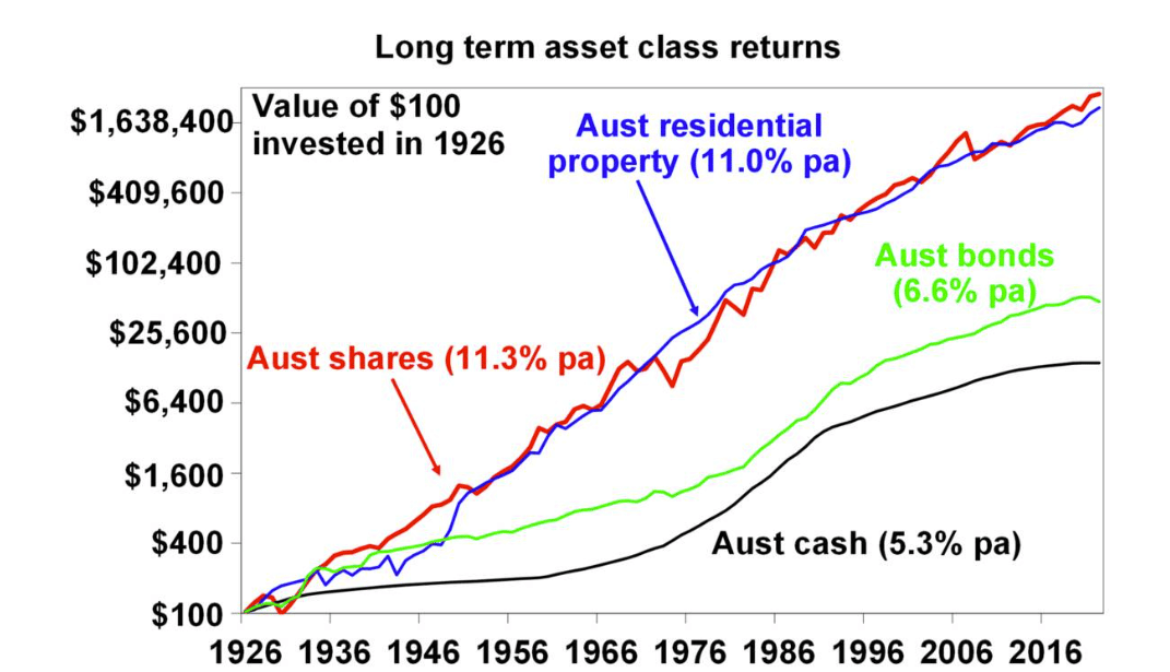The following chart shows how $100 would have performed in the period to May 2022 if invested in various asset classes in 1926 (with all dividends, rents and interest earned reinvested).