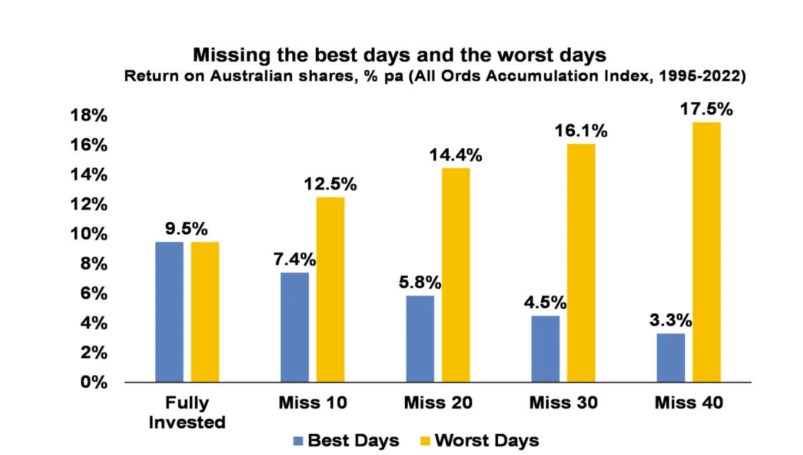 Shane Oliver also illustrates this point clearly with the chart below, showing the outcome of missing the best or worst days in the Australian share market. While it might be tempting to focus on the outcome of missing the worst days by correctly timing the market, in practice this is almost impossible. Typical investors instead tend to get out after the worst days have occurred and miss the best days in the recovery, damaging longer-term returns.